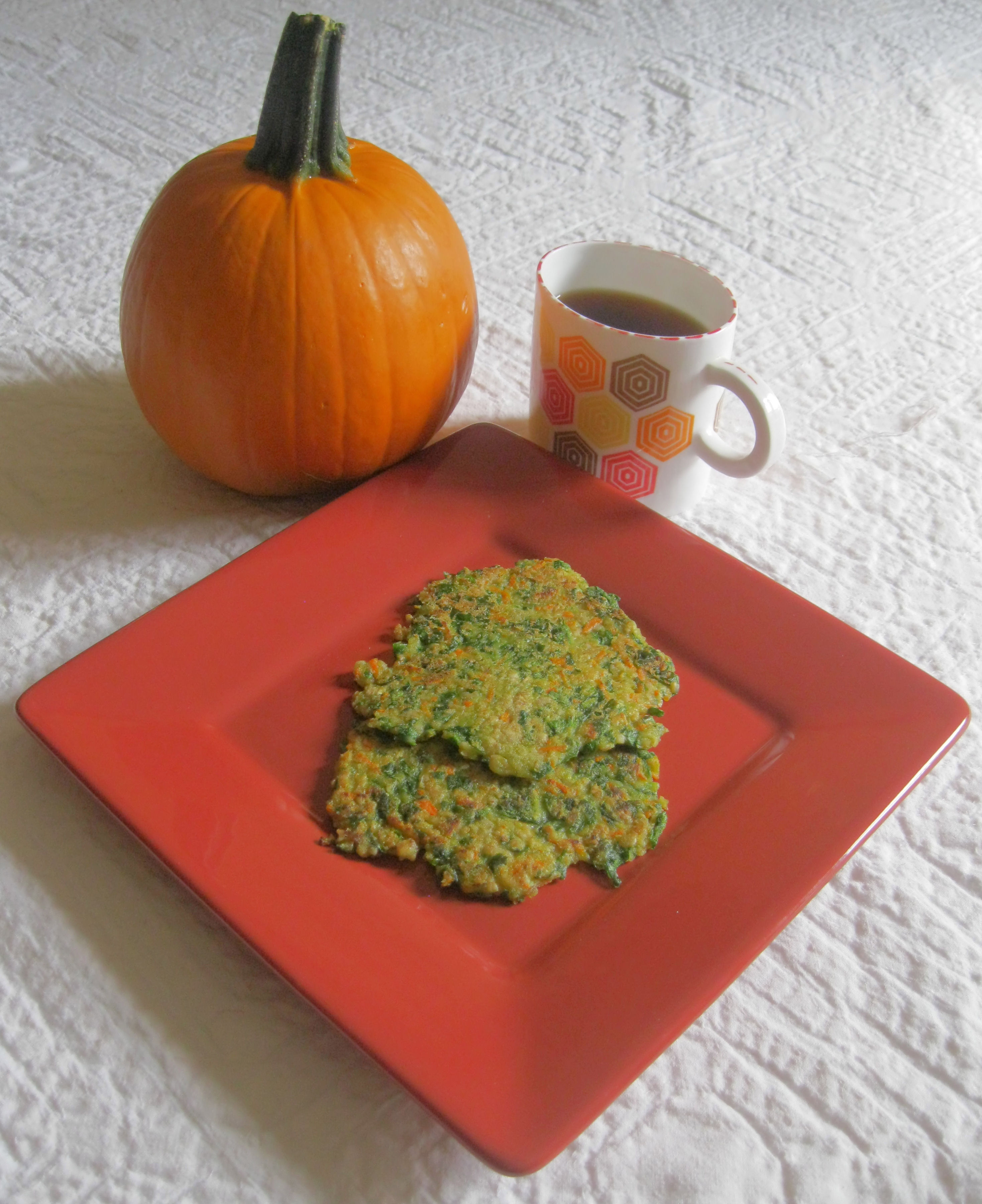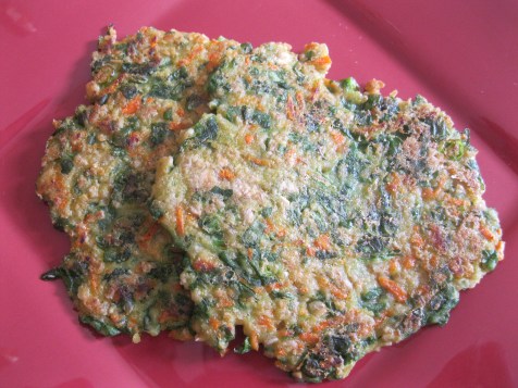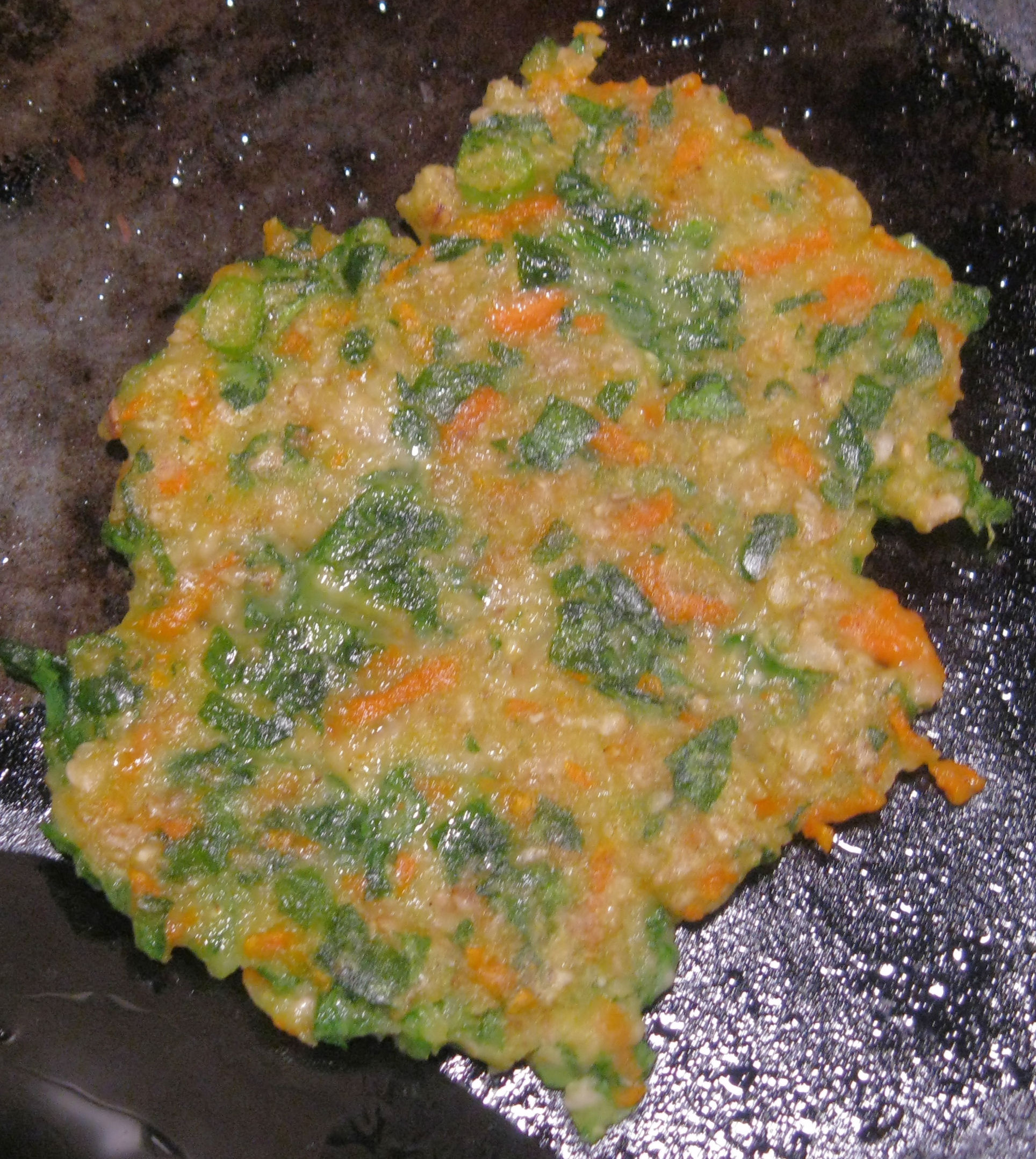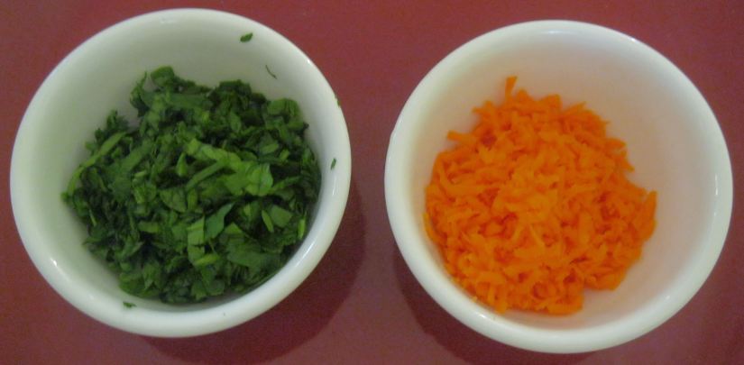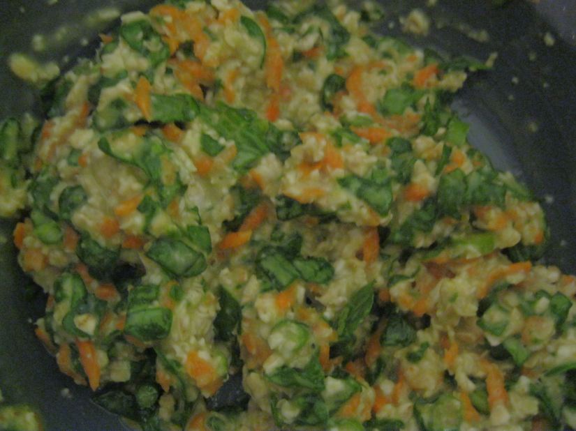 2) Add the rice flour, chopped spinach, shredded carrots and salt to the oats and mix thoroughly. It should be of the consistency of thick cookie batter.