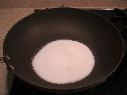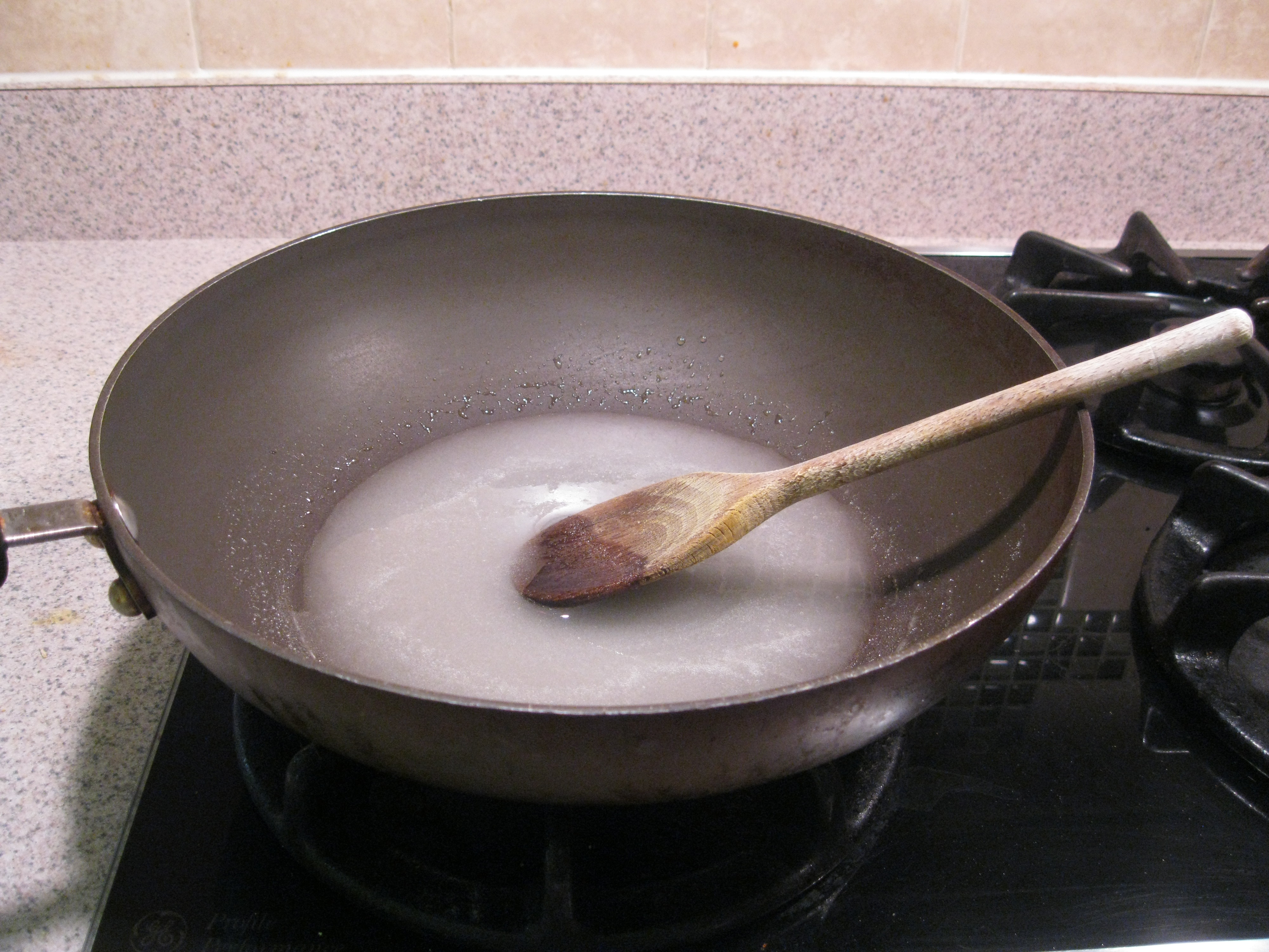 - In a heavy bottomed vessel or good non-stick pan, combine the sugar and water and place the pan on a low to medium flame.
