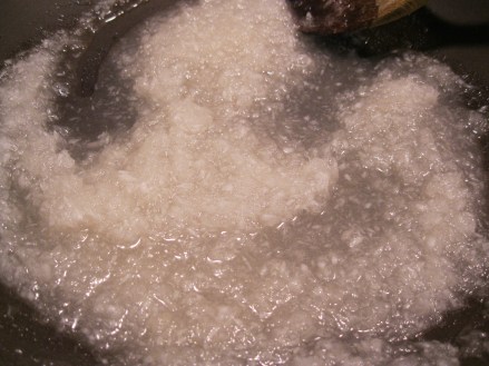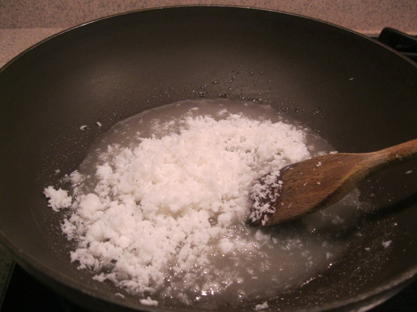 Sugar - Add the coconut gratings once the sugar has completely dissolved and keep stirring.
