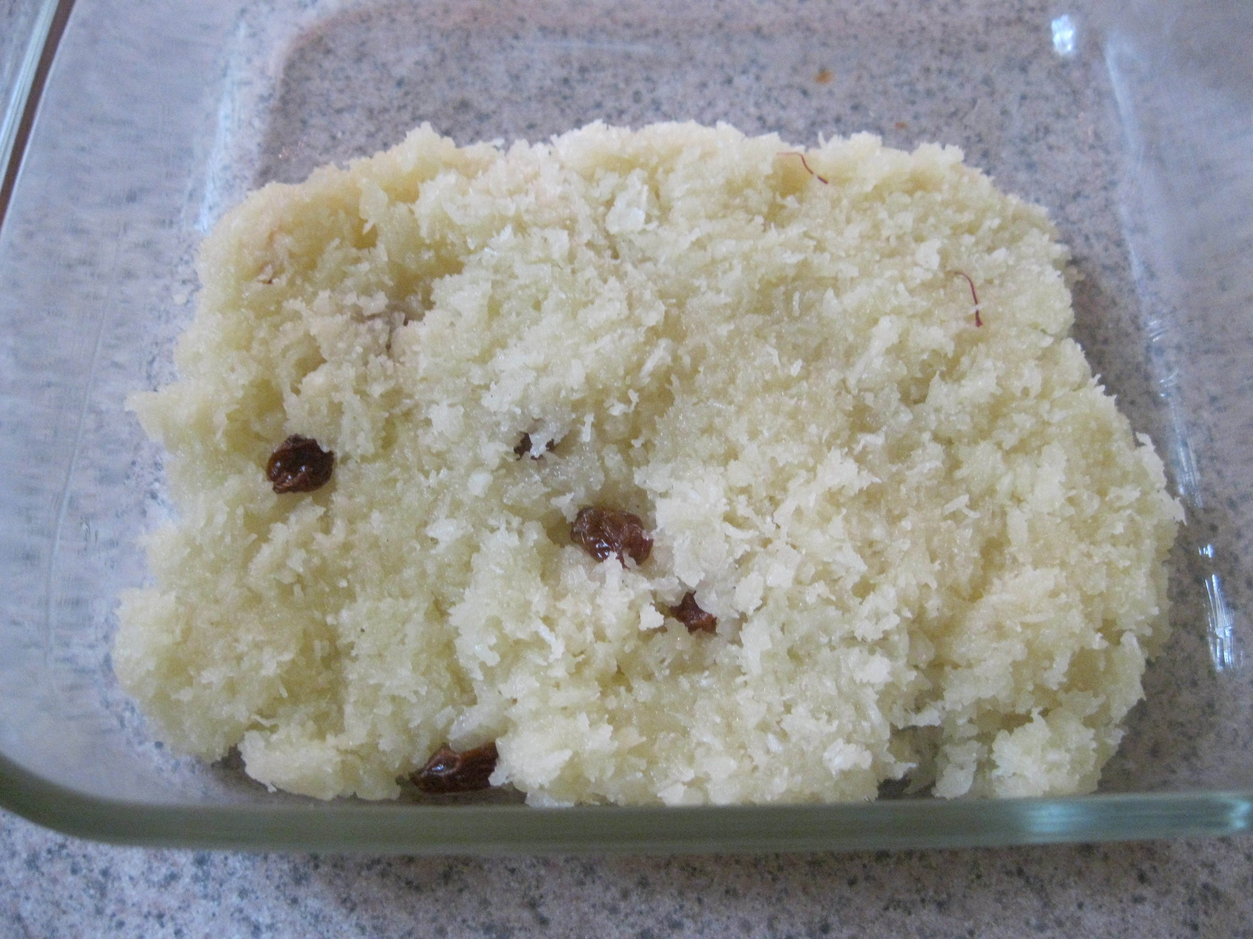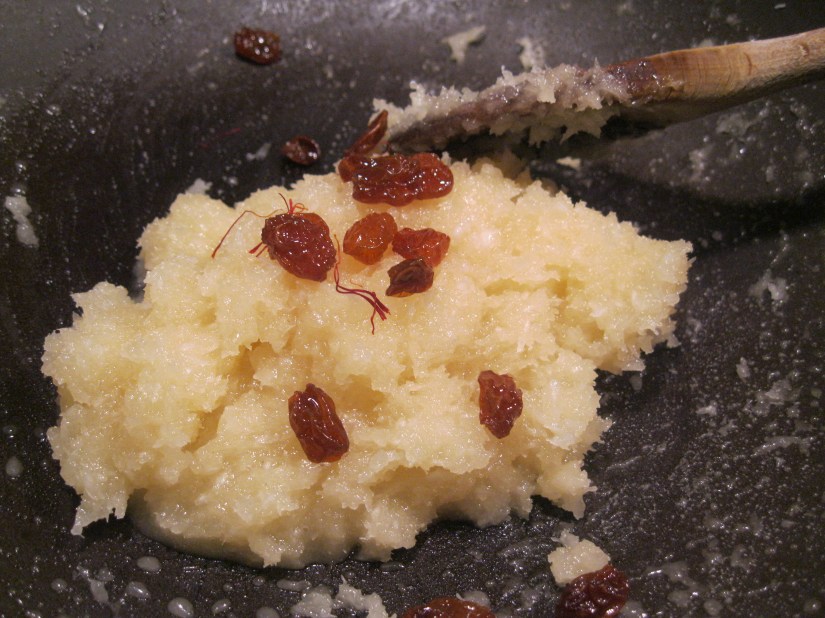 Add raisins and saffron once the mixture dries up and leaves the edges of the vessel. - Immediately pour the mixture into the greased dish and spread it evenly. The back of the wooden ladle can be used to spread the mixture out evenly.