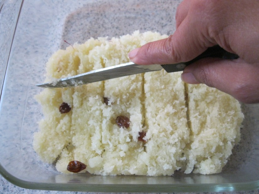- When it has cooled down slightly, cut the mixture with a greased knife into small squares gently.