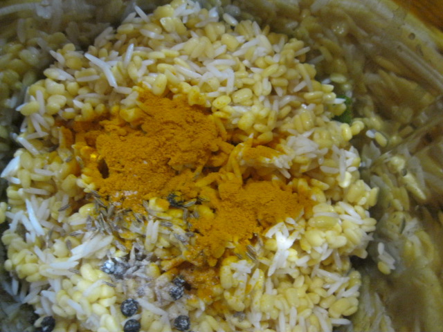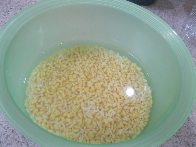 - Wash and soak the mung bean and rice in enough water (that it completely covers the rice and beans) for atleast 3 hours. Add the peppercorn and cumin seeds too. The mixture will absorb water and soften as well as swell up.