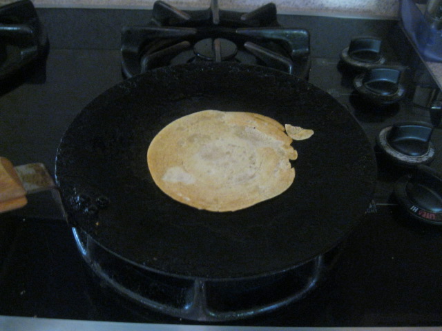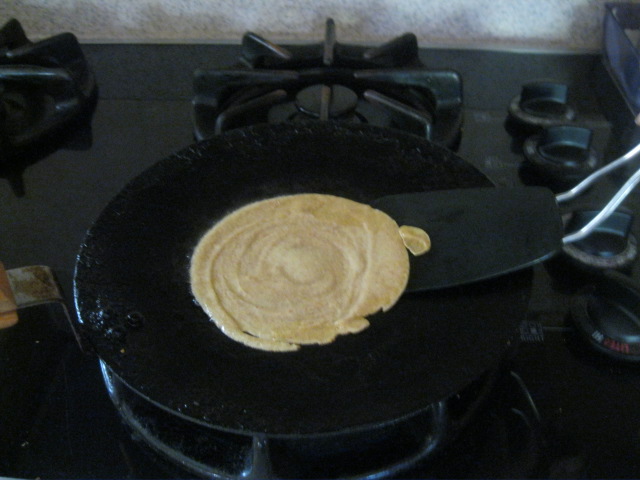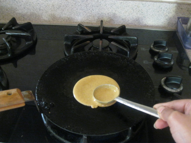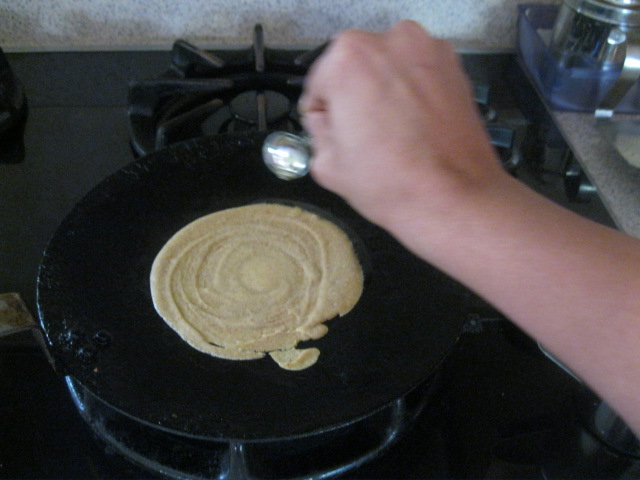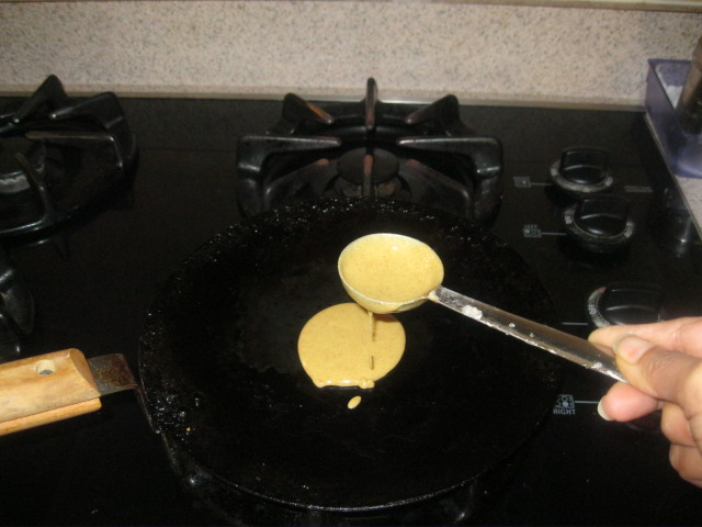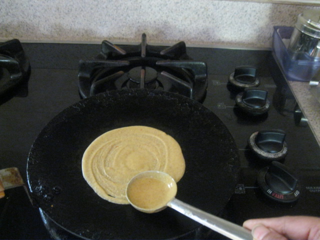 Spread the batter by moving ladle in a circular fashion towards the outer edge. - Dot the edges of the crepe with any oil you are not allergic to. Let it cook so that the top of the crepe is almost try.