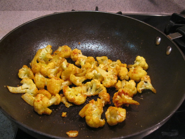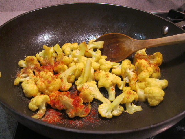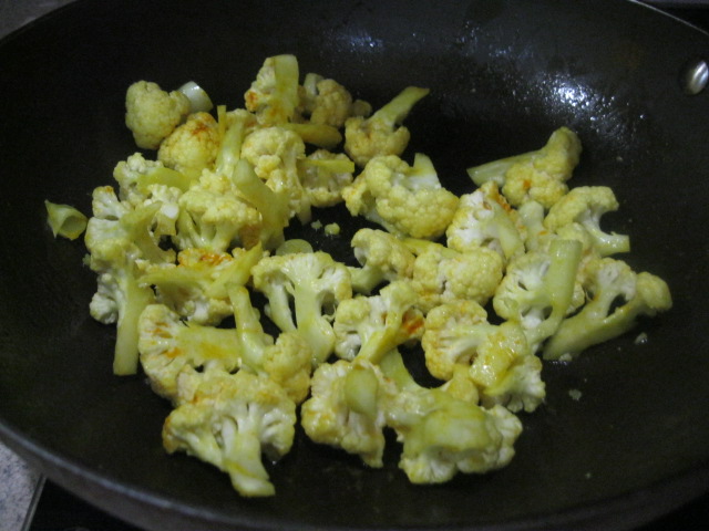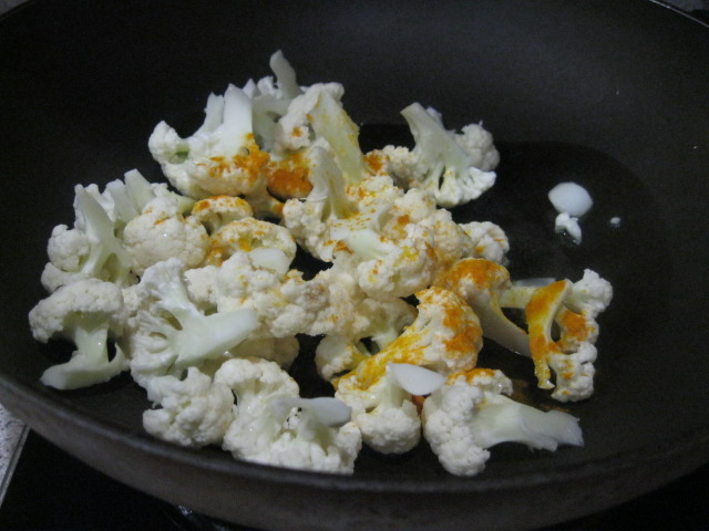 - Now add the cauliflower and the tumeric and stir so that the tumeric coats the florets evenly.