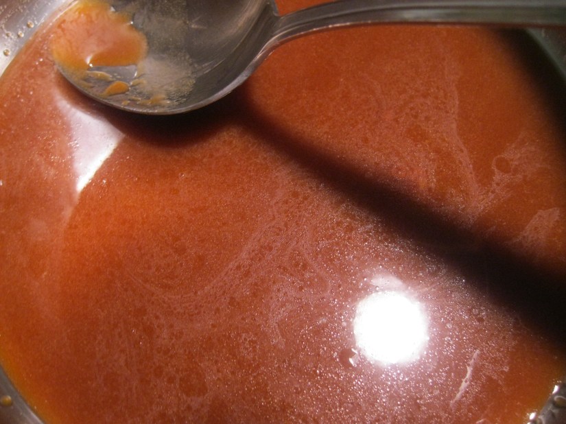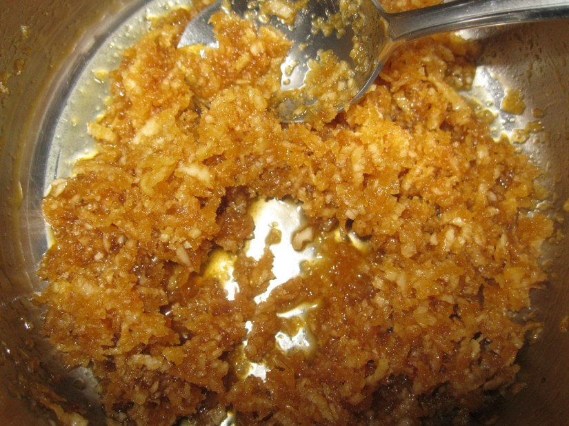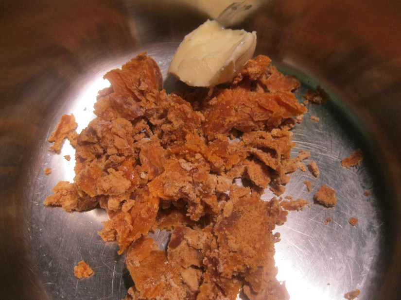 3. Place a heavy bottomed vessel on low to medium flame. Add the jaggery/ dark brown sugar, 1 tbsp Earth Balance shortening and 1/8th cup water. Stir the mixture constantly till there are no lumps and the syrup just starts thickening. This should take about 5 to 7 minutes.