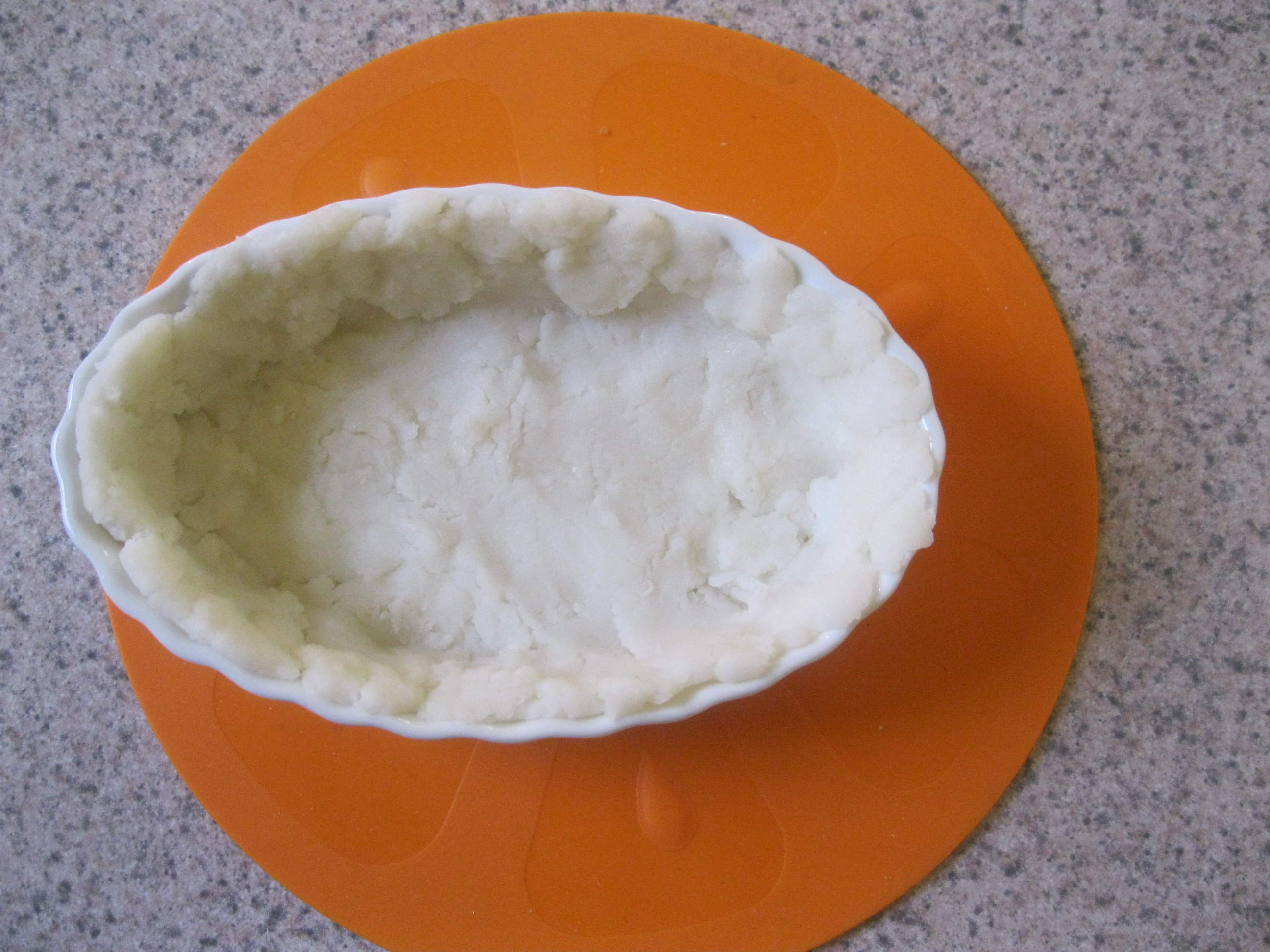 7. With the tips of greased fingertips gently spread the dough to a size large enough to fit the bottom of the ramiken. Rice flour dough will be a little brittle and form cracks as your spread it. Do not let that worry you. Just seal it with your fingers. In fact, the few cracks and rough edges add to the homemade country appeal.