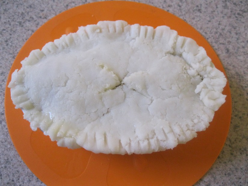 10. Now flatten out another ball of dough to fit the top of the mini-pie and lay it gently on top of the filling. Pinch the edges just like a regular pie. Use the edge of a greased fork to give the crimped look. Prepare the remaining mini-pies in a similar way.