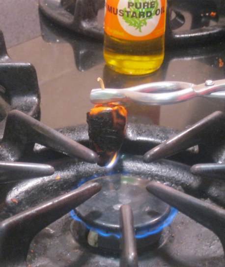 , hold the stalk of the red chilli and roast it over the stove fire.
