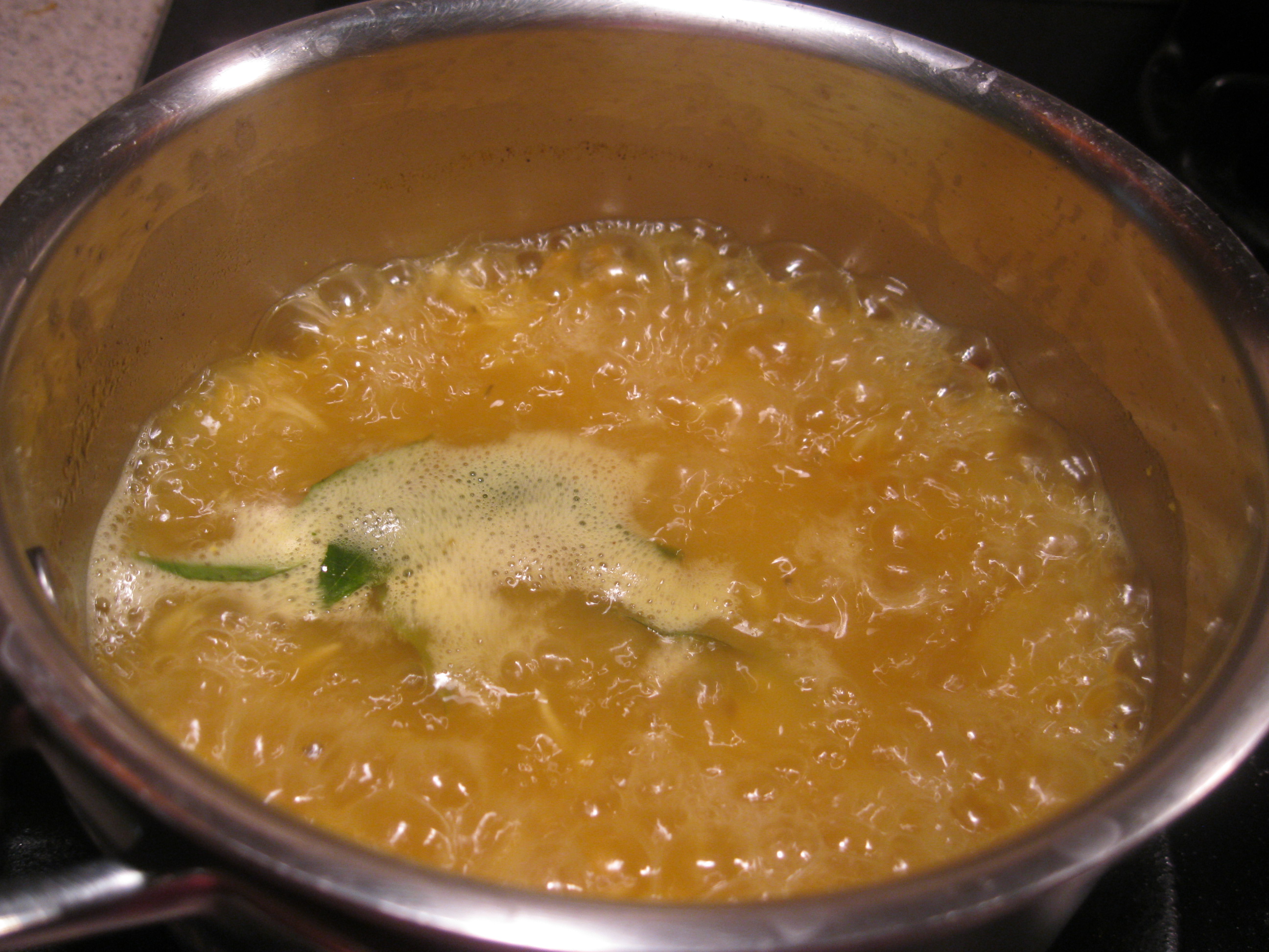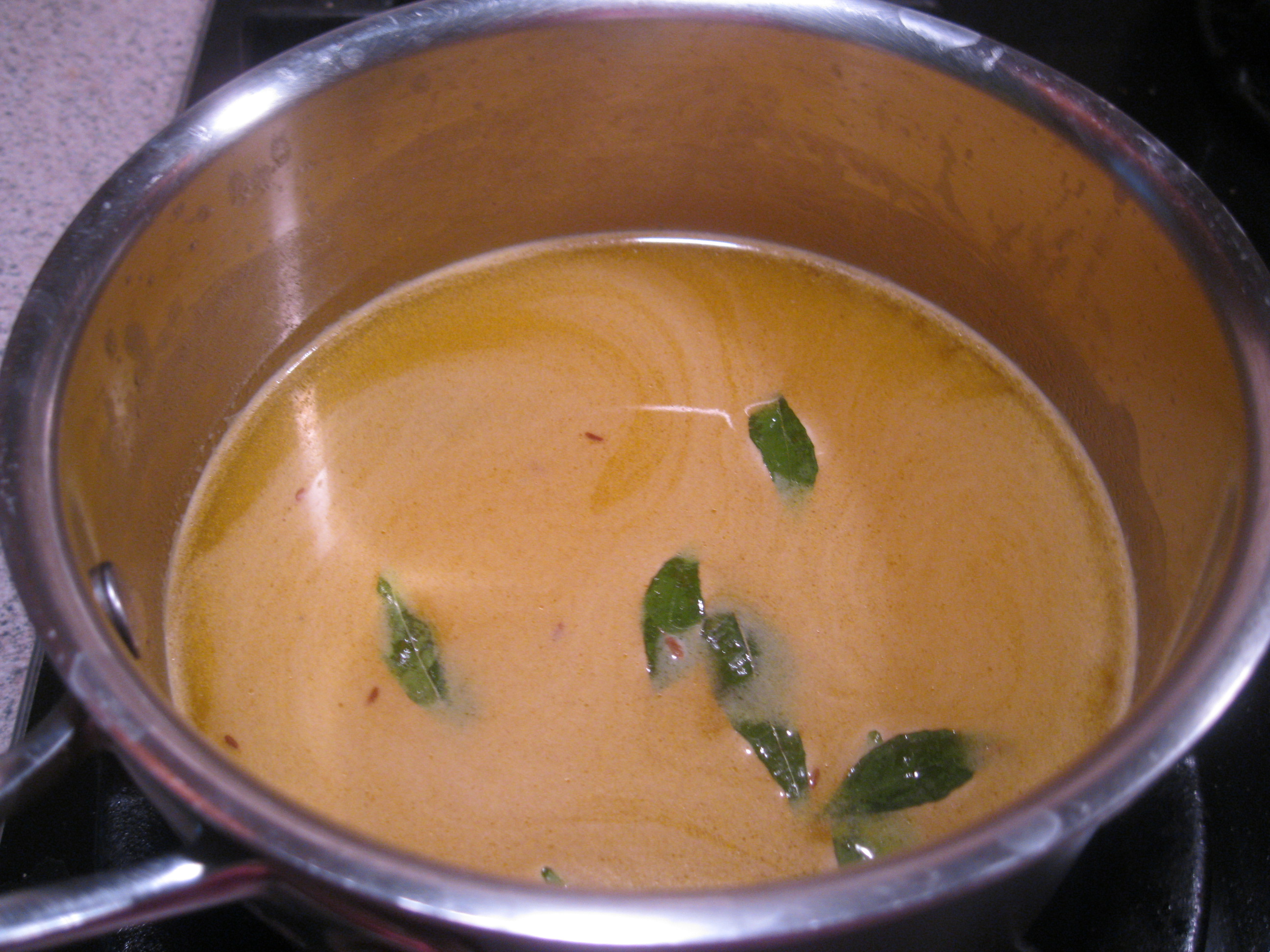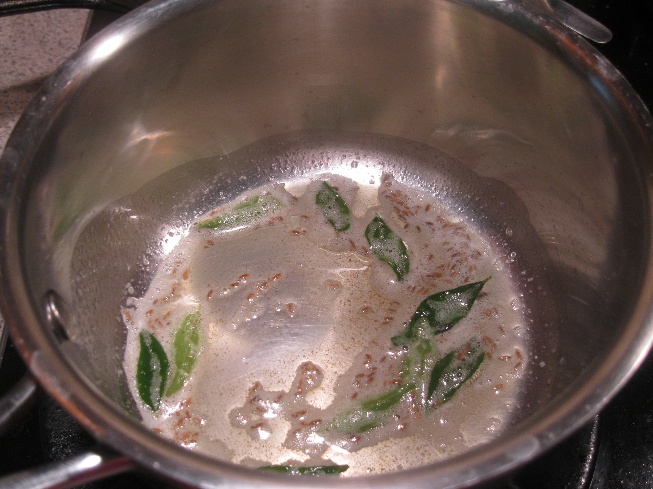 - Heat the oil in a heavy bottomed quart vessel. Add the cumin seeds and curry leaves to the heated oil and stire till the cumin seeds become a darker brown.
