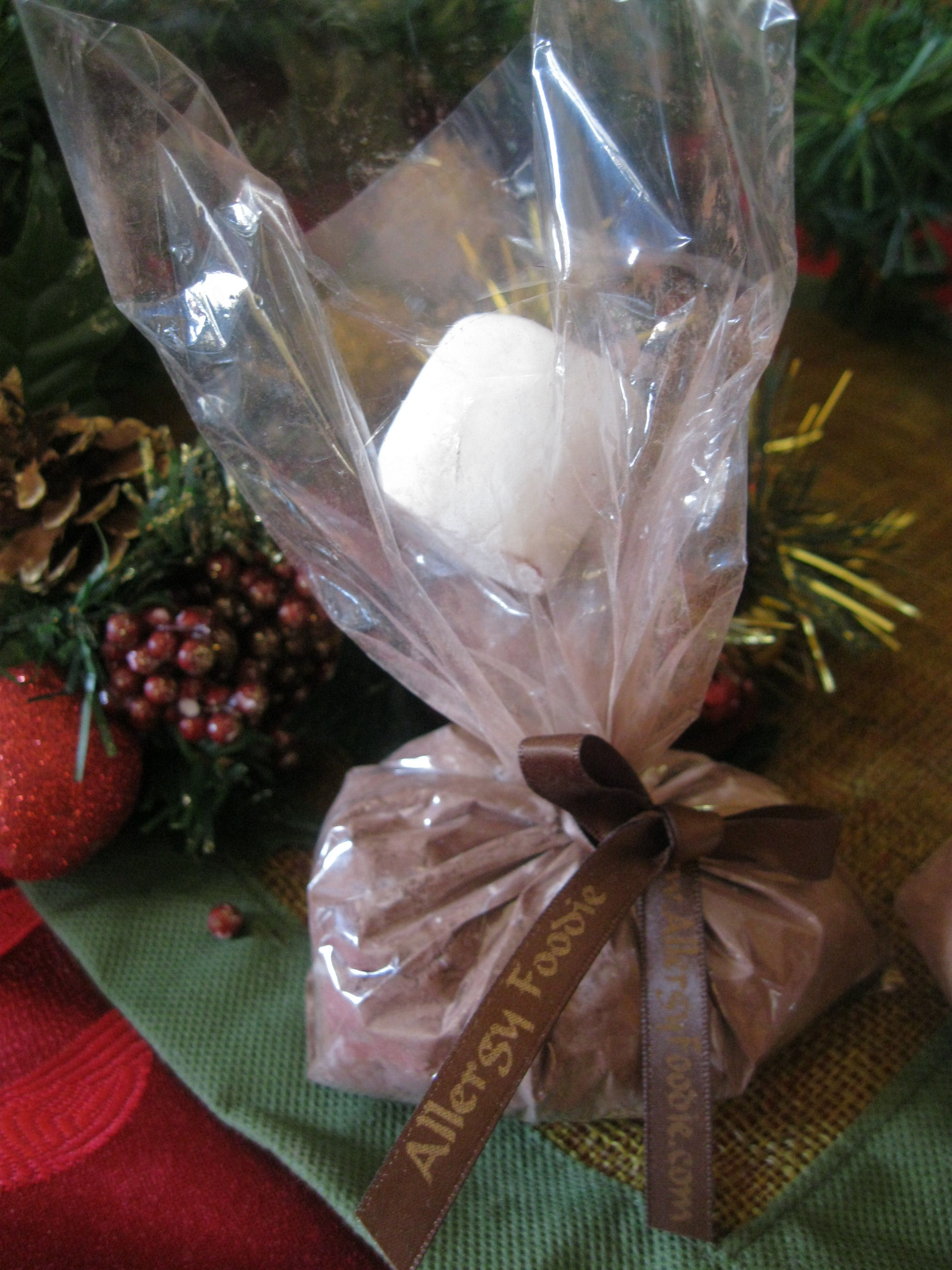 Hot chocolate mix: Unsweetened pure cocoa powder, dairy-free chocolate chips, sugar with a hint of cinnamon and chilli powder to make it truly gourmet 🙂 Packaged with egg-free Marshmallows – cold winter evenings beckon…