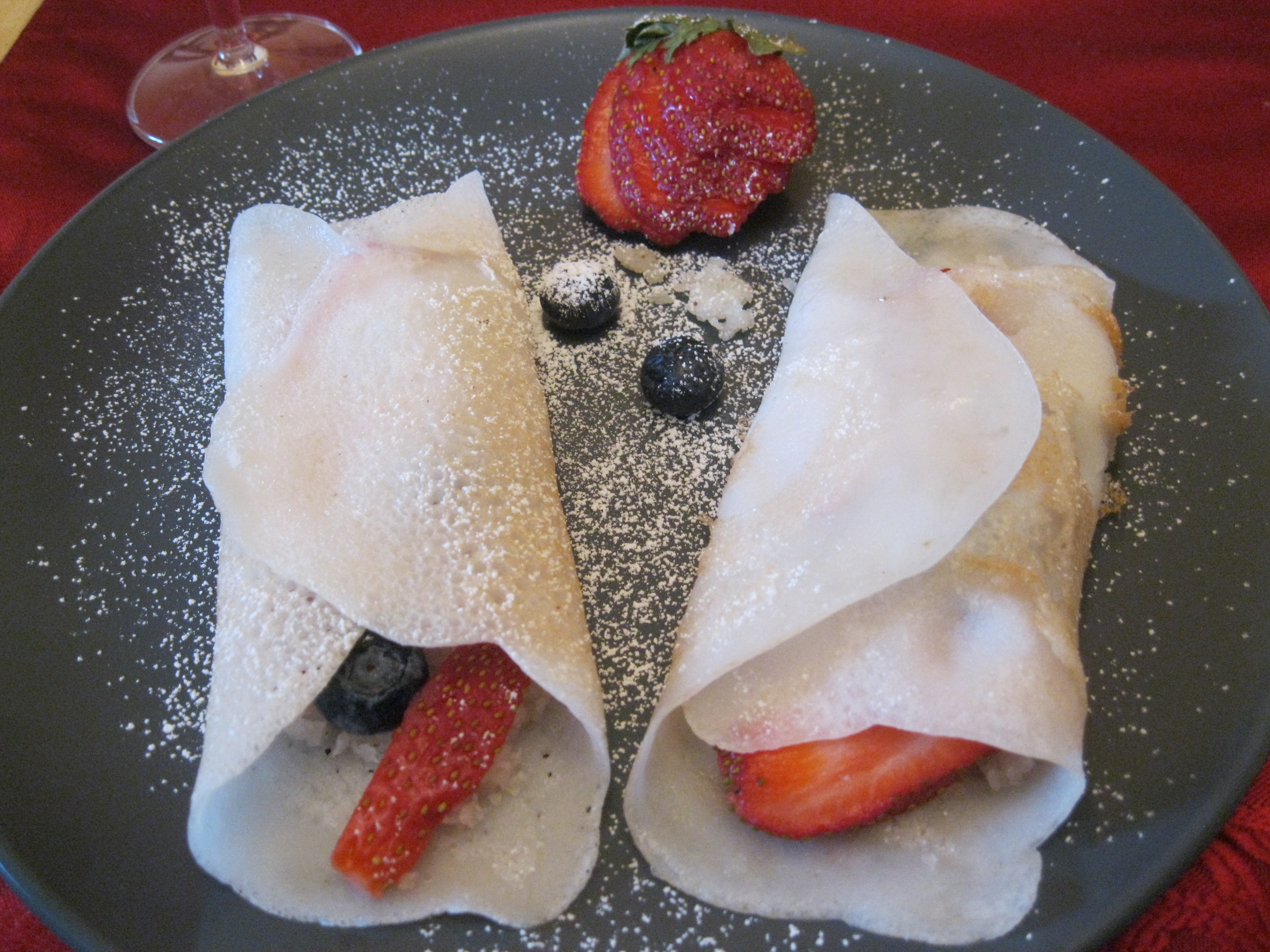 Accompanied with allergy-friendly lightly sweetened crepes stuffed with mildly sweetened freshly grated coconut with just a hint of cinnamon, fresh organic strawberries and blueberries served with a dusting of powdered sugar…