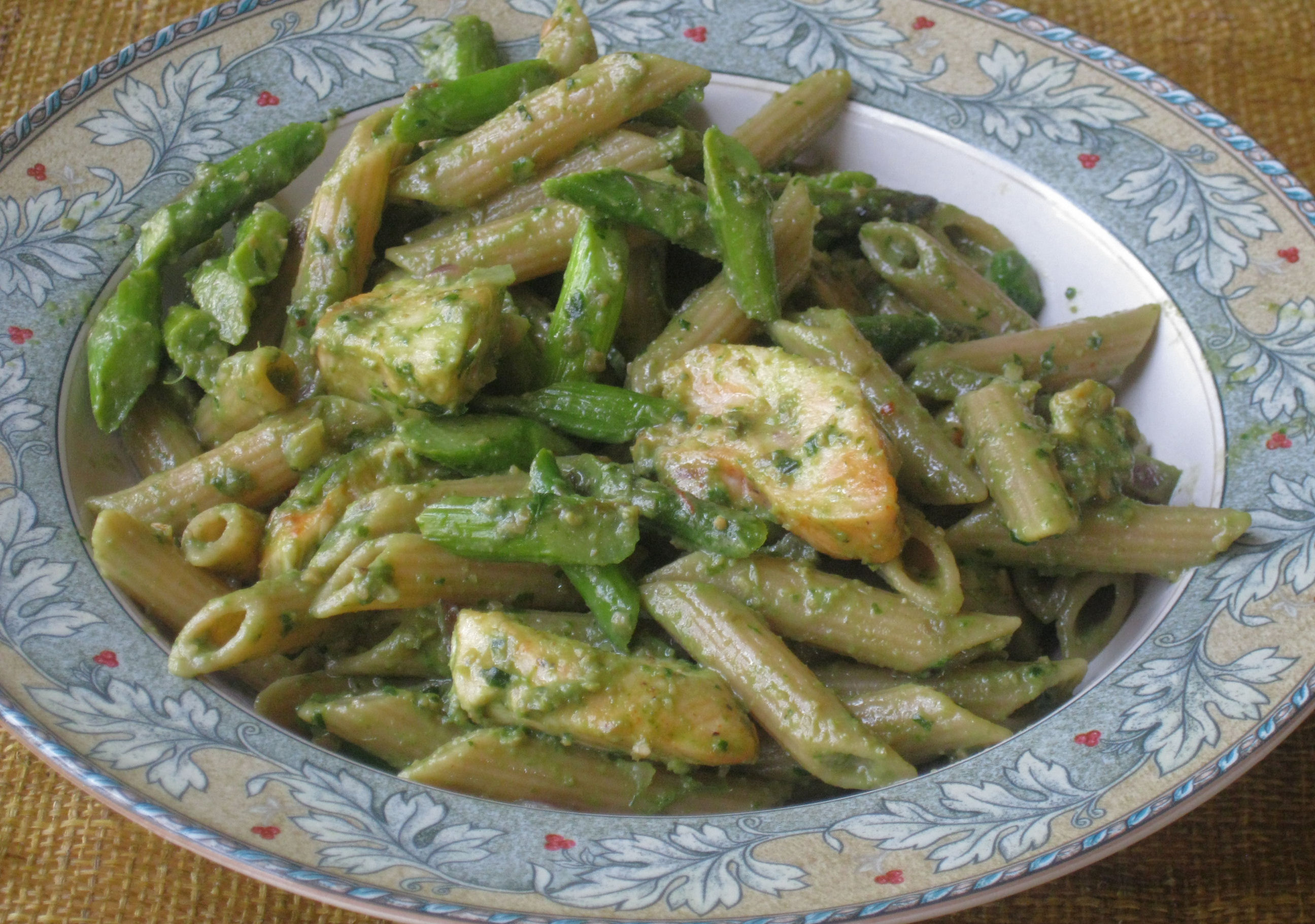 A leisurely lunch of chicken and asparagus brown rice pasta tossed in allergy friendly cilantro and pumpkin seed pesto made from scratch with extra virgin olive oil. This is one of those times when I wish my readers could smell the dish – just bursting with the fresh flavors of cilantro and roasted pumpkin seeds – a perfect late winter pasta dish!