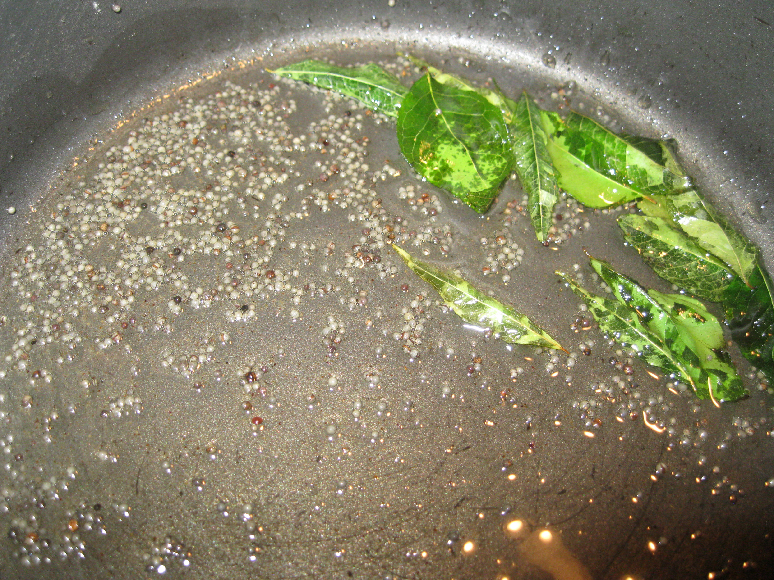 - Heat the oil in a heavy bottomed pan and add the mustard seeds. When they start popping, add the asafoetida and curry leaves.