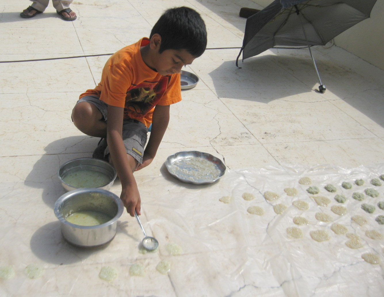 - Spread a plastic sheet in the sun and spread a spoonful making small circles on the sheet while the batter is still warm.
